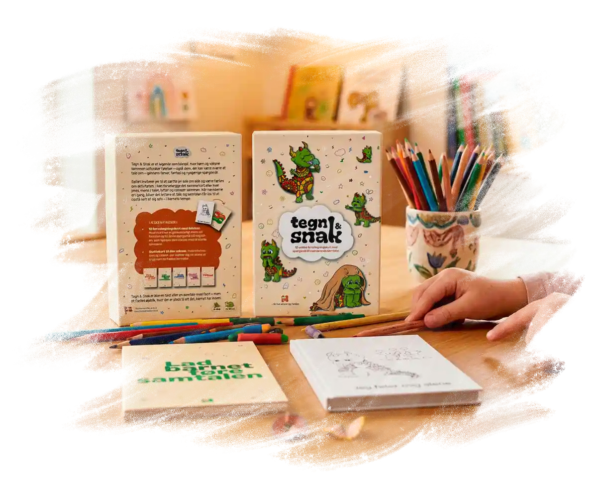 Tegn & Snak er et kreativt samtaleredskab, der hjælper børn og voksne med at tale om følelser og svære oplevelser gennem tegning og nærvær. Med illustrationskort og guidende spørgsmål bliver det lettere at åbne samtaler i et trygt tempo – uden pres, men med plads til det, der fylder. Sammen skaber I et rum, hvor barnet kan sætte ord, farver og mening på sine tanker.